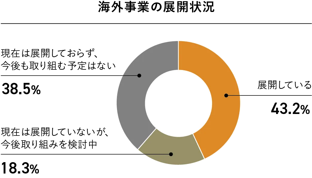 調査によると、海外事業を展開中または今後取り組む予定だという企業は60%を超えています。実際に海外展開を行っている企業は43.2%、取り組みを検討している企業は18.3%という回答が得られました。この結果から、国内市場に依存しつつも、国際的なビジネスチャンスを視野に入れた企業戦略が求められていることがわかります。
