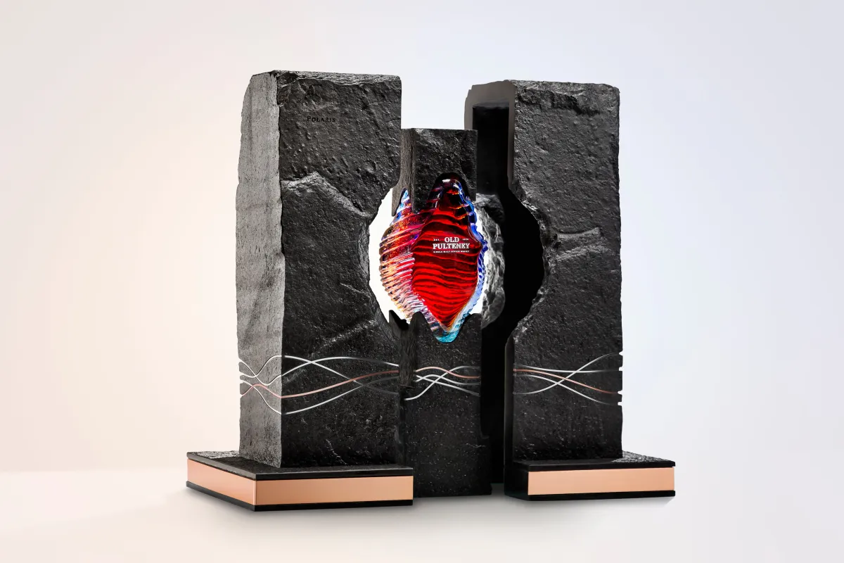 ポラリスは、ウィック近郊の険しい断崖と北海の波の影響を受けて形作られました。地域の職人たちがチームを組み、ウイスキーの物語を体現するアートピースとして仕上げました。特にボトルは、テインのガラス工房「グラスストーム」によって作られた手吹きの青色ガラス。その表面には波のうねりを彷彿とさせる彫刻が施され、光を受けるたびに美しく輝きます。また、外装にはノースストーン社によるケイスネススレートが使用されています。このスレートは、地元の自然の象徴とも言えるもので、ウイスキーと地域を強く結びつけています。さらに、地元のジュエラーによる銅と銀の装飾が施されており、台座には実際に蒸溜所で使用されたポットスチルから取り出した銅板が秘められています。これにより、オールドプルトニーの歴史とその魂が一つの形となっていることが感じられます。