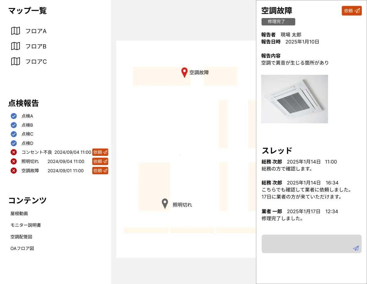 これに加えて、報告された地点を管理画面のマップ上で確認できるため、迅速な対応検討が可能になります。このように、IndooARは職場のデジタルトランスフォーメーションを進め、工事の効率を大幅に向上させることを目的としています。