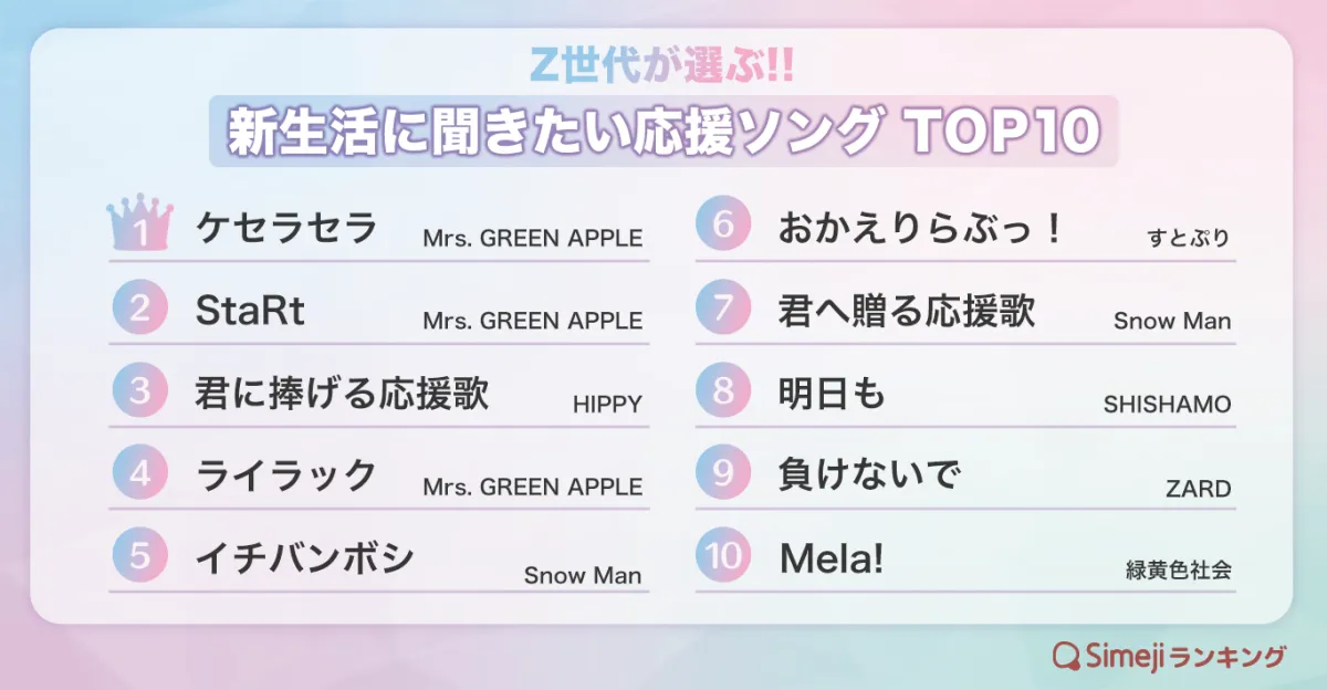今回のランキングは、どの曲も新生活を応援するためにピッタリの楽曲です。Z世代の心を掴み、新しいことに挑む勇気を与えるメロディーたちが揃っています。新しい一歩を踏み出すための力強いエールを受け取り、あなたの新生活を明るいものにしてください!