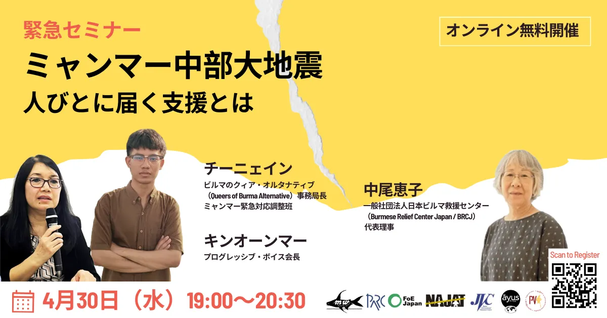 2025年4月30日(水)の19時から、オンラインで緊急セミナー「ミャンマー中部大地震 人びとに届く支援とは」が開催されます。3月28日に発生したミャンマー中部の地震による影響は甚大であり、応援活動が進められていますが、同時にミャンマー軍の人権侵害が深刻な問題となっています。本セミナーでは、現地の救援状況やミャンマー軍の行動が支援活動に与える影響について考察します。