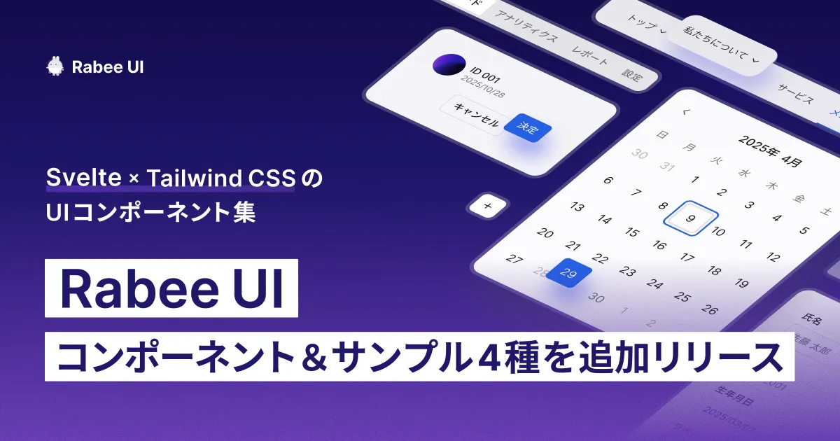 株式会社Rabeeが展開している「Rabee UI」が、これまでの機能に新しいサンプルを追加しました。SvelteとTailwind CSSを基盤にしたこのUIコンポーネント集は、プロダクト開発を支援するために幅広い選択肢を提供しています。