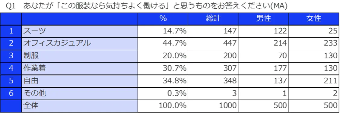 最も多くの回答を得たのは「オフィスカジュアル」で、44.7%の人が挙げました。次いで「自由」が34.8%、「作業着」が30.7%、「制服」が20%、「スーツ」が14.7%でした。男女別で見てみると、男性では「作業着」が177人、「オフィスカジュアル」が214人、「自由」が137人、「スーツ」が122人の順に多く、一方女性は「オフィスカジュアル」が233人、「自由」が211人、「制服」が130人、「作業着」が130人と、快適さや多様性を求める傾向が強いことが浮かび上がります。