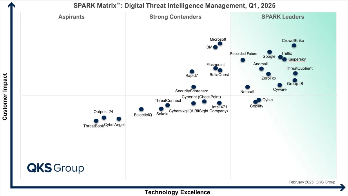 Kasperskyが、QKS Groupの「SPARK Matrix™:Digital Threat Intelligence Management」の2025年版において、卓越した脅威インテリジェンスで最高評価を獲得しました。この評価は、Kasperskyが提供する高度なサイバー脅威の検知・特定能力を証明するものです。