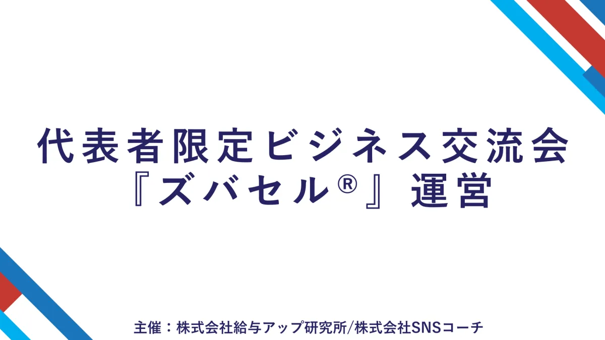 法人の代表者を対象とした新たな交流の場『ズバセル®︎』が、株式会社給与アップ研究所と株式会社SNSコーチによって開催されます。この交流会の狙いは、単なる人脈作りにとどまらず、実際にビジネスの売上に結びつくようなマッチングの機会を提供することです。参加するのは「ギバーの精神」を持つ経営者だけで、受け身ではなく積極的に他者に貢献する姿勢が求められます。