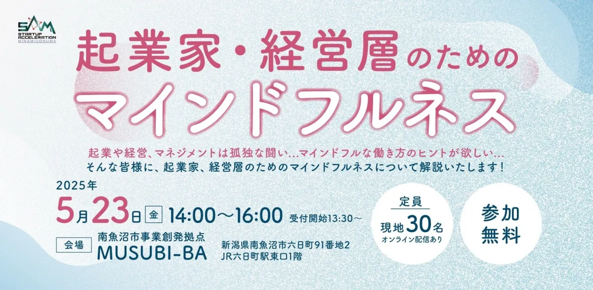 今年度は基本的な内容をさらに進化させた「スタートアップアクセラレーション南魚沼アドバンス」という形で実施予定です。初回のセッションは「起業家、経営層のためのマインドフルネス」をテーマに、2025年5月23日(金)に開催される予定です。マインドフルネスというテーマを使って、持続可能な起業家としての在り方を考察します。