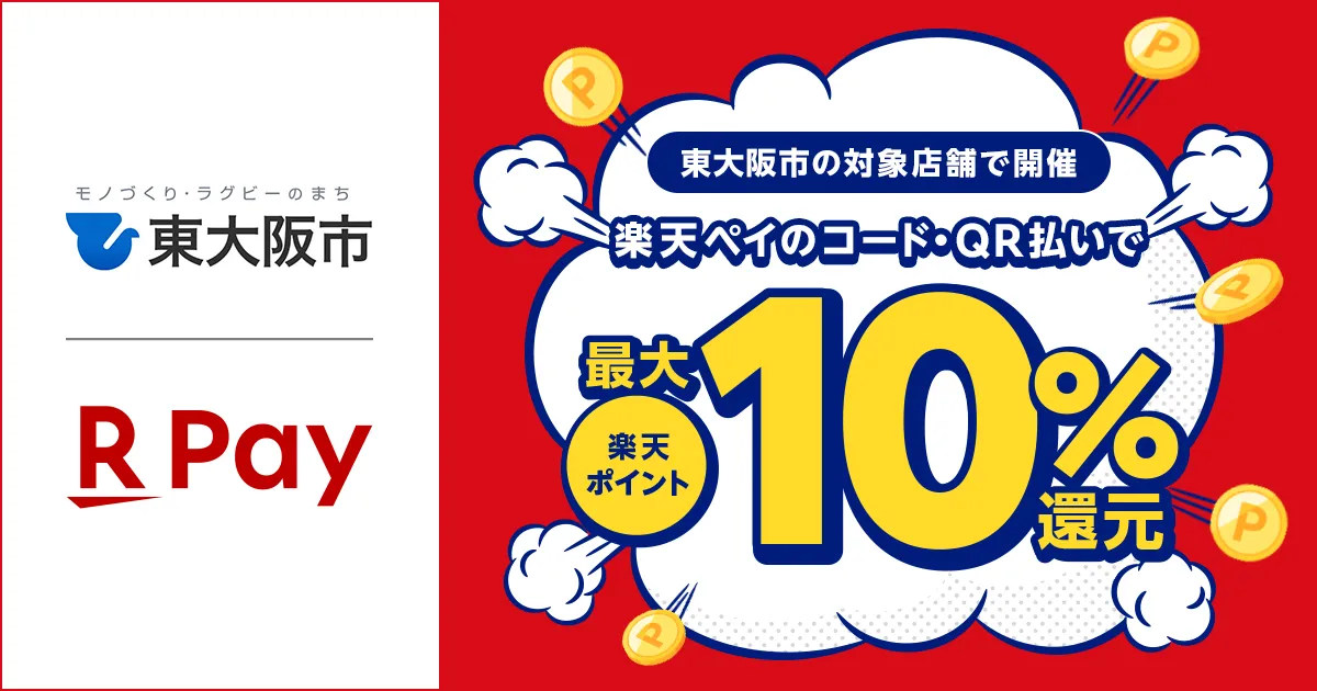 本キャンペーンは、大阪府東大阪市内の対象店舗において、楽天ペイを使用したコード決済を行うことで得られる特典です。具体的には、キャンペーン期間中に楽天ペイでの決済を行うと、決済金額の最大10%を楽天ポイントとして受け取ることができます。