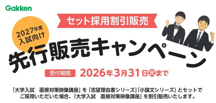 現在、先行販売キャンペーンも実施中です。大学入試面接対策映像講座を、Gakkenの他の教材とセットで購入すると割引がなされるため、春の入試シーズンに向けてお得に準備を進めるチャンスです。キャンペーンの詳細は株式会社 Gakkenの公式ウェブサイトで確認できます。