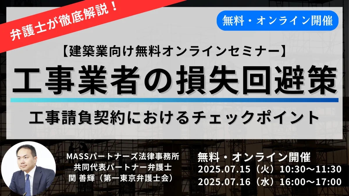 建築業界で活動している方々に向けて、弁護士による無料オンラインセミナー「工事業者の損失回避策」が実施されることが決定しました。このセミナーでは、工事請負契約に関連した重要なチェックポイントについて具体例を交えて解説します。