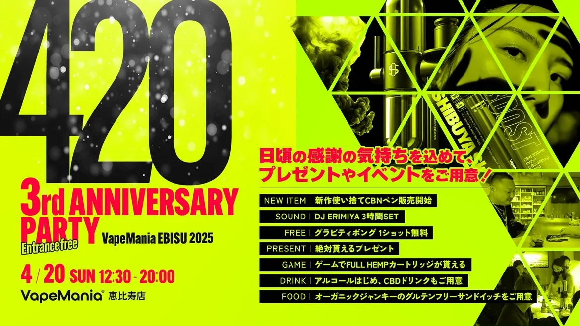 この機会に、VapeMania恵比寿店の3周年「420パーティ」に参加して、CBDやカンナビノイドを取り巻くカルチャーを直接体験してみてはいかがでしょうか?皆様のご来店を心よりお待ちしています。