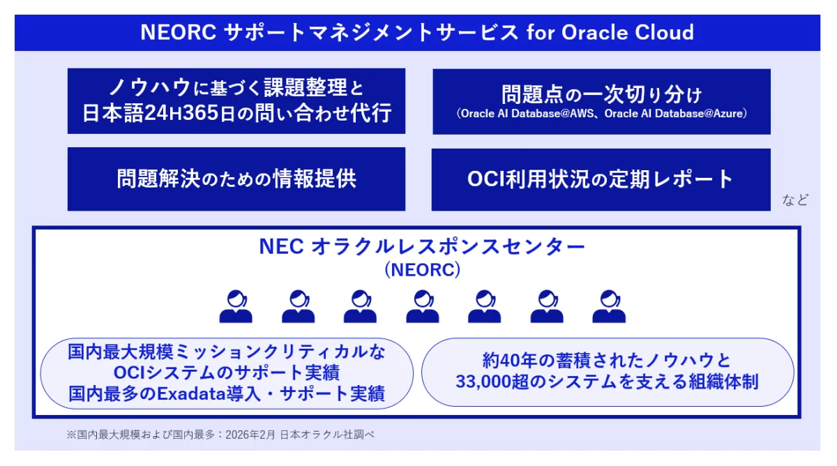 NECは、企業がOracle Cloud Infrastructure(OCI)やその上で稼働する「Oracle AI Database」などを利用している際の導入・運用を支援する新たなサービス「NEORC サポートマネジメントサービス for Oracle Cloud」を提供開始しました。このサービスは、OCIやOracle AI Databaseの問題を、迅速に解決することを目的としています。