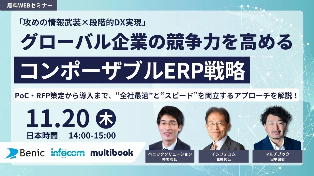 2025年11月20日(木)に開催される無料ウェブセミナー『攻めの情報武装×段階的DX実現』では、グローバル企業が競争優位を確立するための最新のコンポーザブルERP戦略が紹介されます。主催の株式会社マルチブックは、ベニックソリューション株式会社およびインフォコム株式会社と協力し、知識豊富な専門家たちが登壇します。