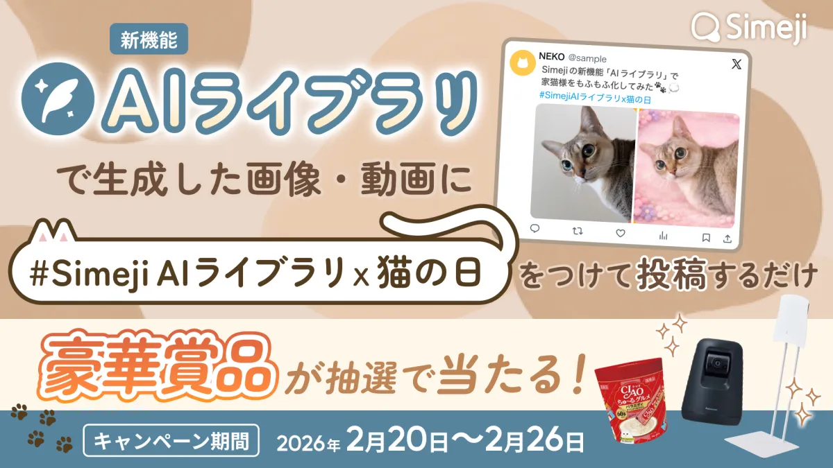 「Simeji」は、バイドゥ株式会社が提供するきせかえ顔文字キーボードアプリで、iOSとAndroid両対応です。Z世代を中心に人気を博し、2025年4月時点で7,000万ダウンロードを記録しているこのアプリが、2026年の猫の日に合わせて特別なキャンペーンを開催します。仕掛けは新機能「AIライブラリ」と、参加者が楽しめる抽選イベントです。