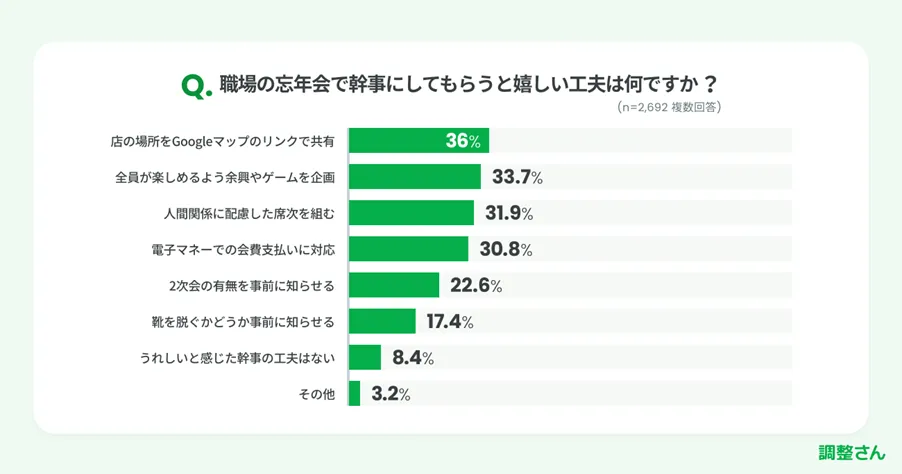 幹事にしてもらうとうれしい工夫についての調査結果では、1位に「店の場所をGoogleマップのリンクで共有」が選ばれました。この結果は、現代のデジタル化が進んでいることを示しています。また、2位に「全員が楽しめるよう余興やゲームを企画」、3位には「人間関係に配慮した席次を組む」が続いています。