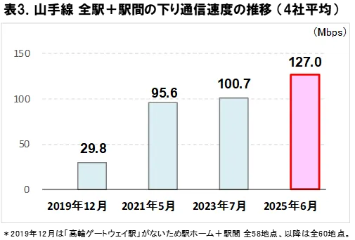最後に、下り通信速度の最速地点と最遅地点についても報告します。最も高い速度が確認されたのは目黒駅の391.5Mbpsで、田町駅、鶯谷駅、五反田駅と続き、これらの駅は300Mbpsを超えました。しかし、最も遅い地点は品川~大崎間で3.4Mbpsという結果に留まっており、追加の改善が必要な状況です。特にこの区間の速度は前回調査に比べて低下しており、今後の注目が集まります。