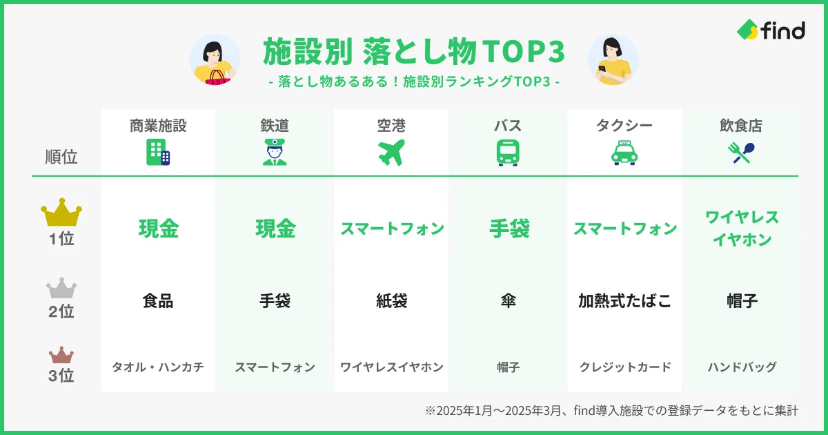 findが集計したデータによると、施設ごとに特定のアイテムが多く落とされる傾向があることがわかります。商業施設では、支払い時に直接使用することが多い現金が多く見られ、加えて購入した食品や生活用品も頻繁に忘れられています。特に、疲れを癒すためにひと休みした際、周囲を見回すことなく、手元の商品を忘れてしまうケースが目立つとのこと。