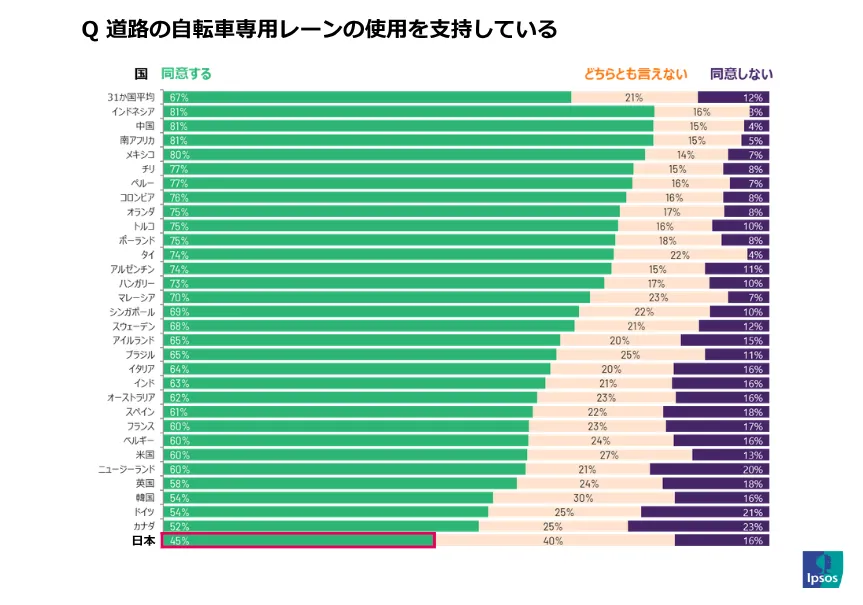 最近、イプソス株式会社が発表した「イプソスモビリティレポート2026」が、我国における自転車専用レーンの支持率を明らかにしました。その結果、日本は31か国中で最も支持率が低く、わずか45%という数値が浮かび上がったのです。また、「どちらともいえない」と答えた人が40%に達し、他国に比べて特有な現状があることがうかがえます。