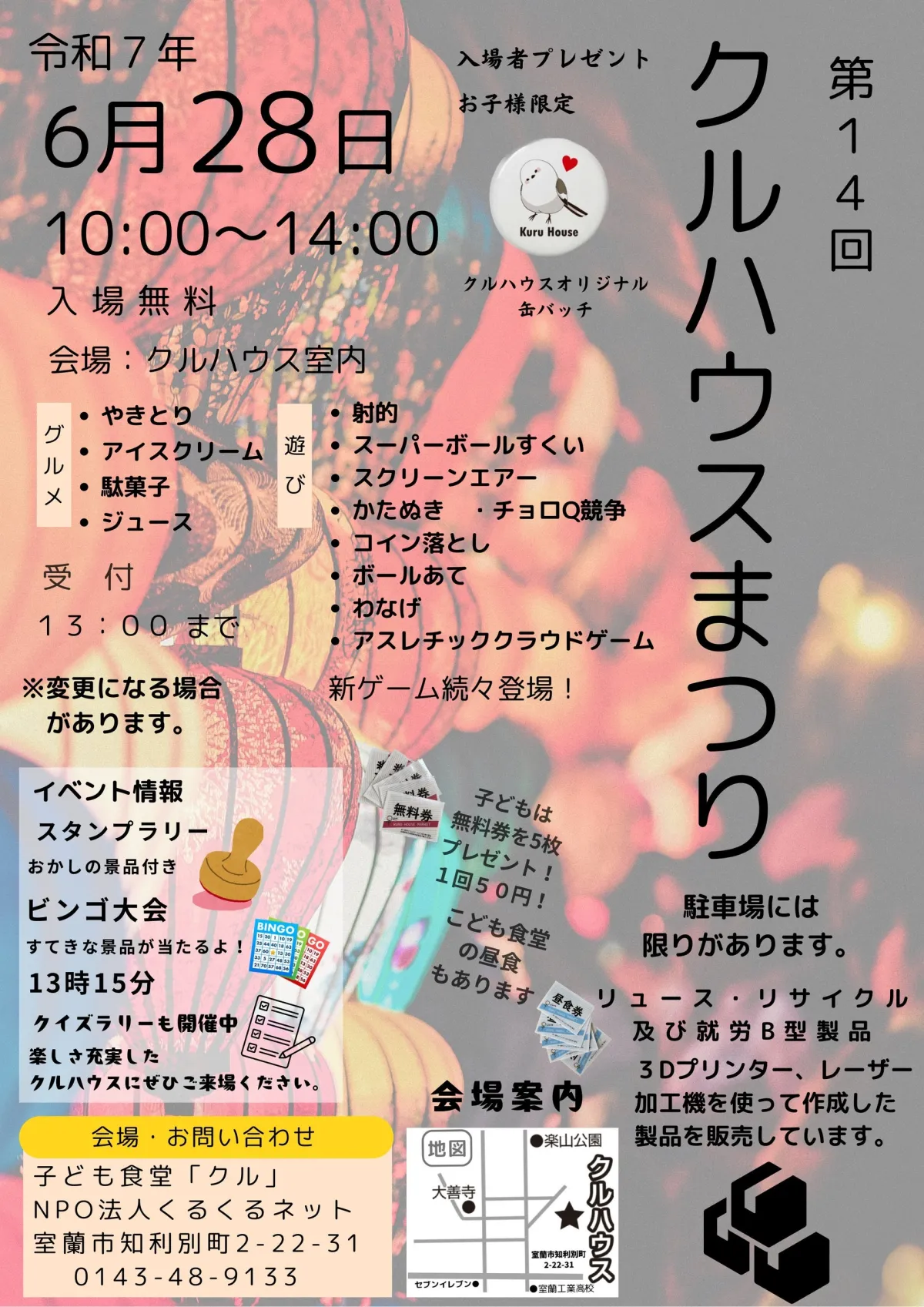 2025年6月28日(土)、北海道室蘭市のNPO法人くるくるネットが主催する恒例イベント「第14回クルハウスまつり」が行われます。この祭りは地域の子どもたちや保護者にとって、心温まる交流の機会となっており、毎年多くの参加者が訪れています。入場は無料で、会場は「クルハウス」と称する室内となっており、安心して楽しめる居場所として知られています。