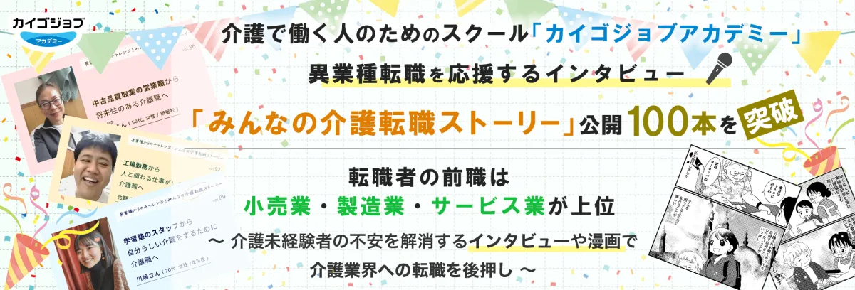 介護業界が直面している人手不足問題に対し、株式会社エス・エム・エスが運営する「カイゴジョブアカデミー」は、異業種から介護業界への転職を希望する方々を積極的に支援しています。今年、同アカデミーが公開したインタビューシリーズ「みんなの介護転職ストーリー」が、ついに100本を超えました。これにより、介護職に対する理解と興味がますます高まっています。