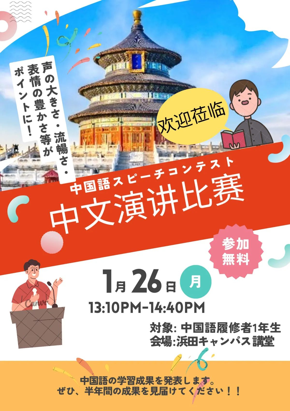 このコンテストは、単なる中国語の学習成果を紹介する場ではなく、学生たちの努力や成長を祝うイベントです。ぜひ皆さんで応援し、将来の中国語のスペシャリストとなる彼らの姿を見届けましょう!