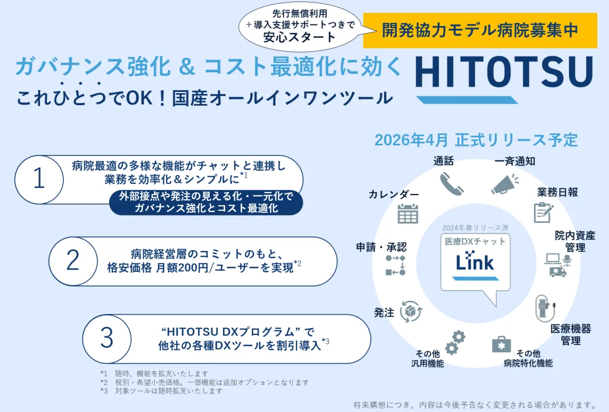 医療のデジタル化を推進するHITOTSUは、医療DXチャットLinkを基にしたオールインワンツールへの進化により、日本の医療業界を変革しようとしています。病院経営層のコミットメントのもと、さらなる開発協力者を募っているため、興味のある医療機関はぜひ手を挙げてほしいと思います。