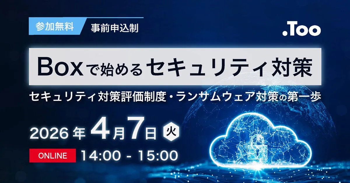 株式会社Tooは、2026年4月7日(火)に「Boxで始めるセキュリティ対策」というオンラインセミナーを開催すると発表しました。このセミナーでは、最近増加しているランサムウェア対策を中心に、情報の安全な保管やアクセス制御、適切な共有方法に関する基本について学ぶことができます。セミナーではクラウドストレージ「Box」の利用方法についても詳しく解説します。