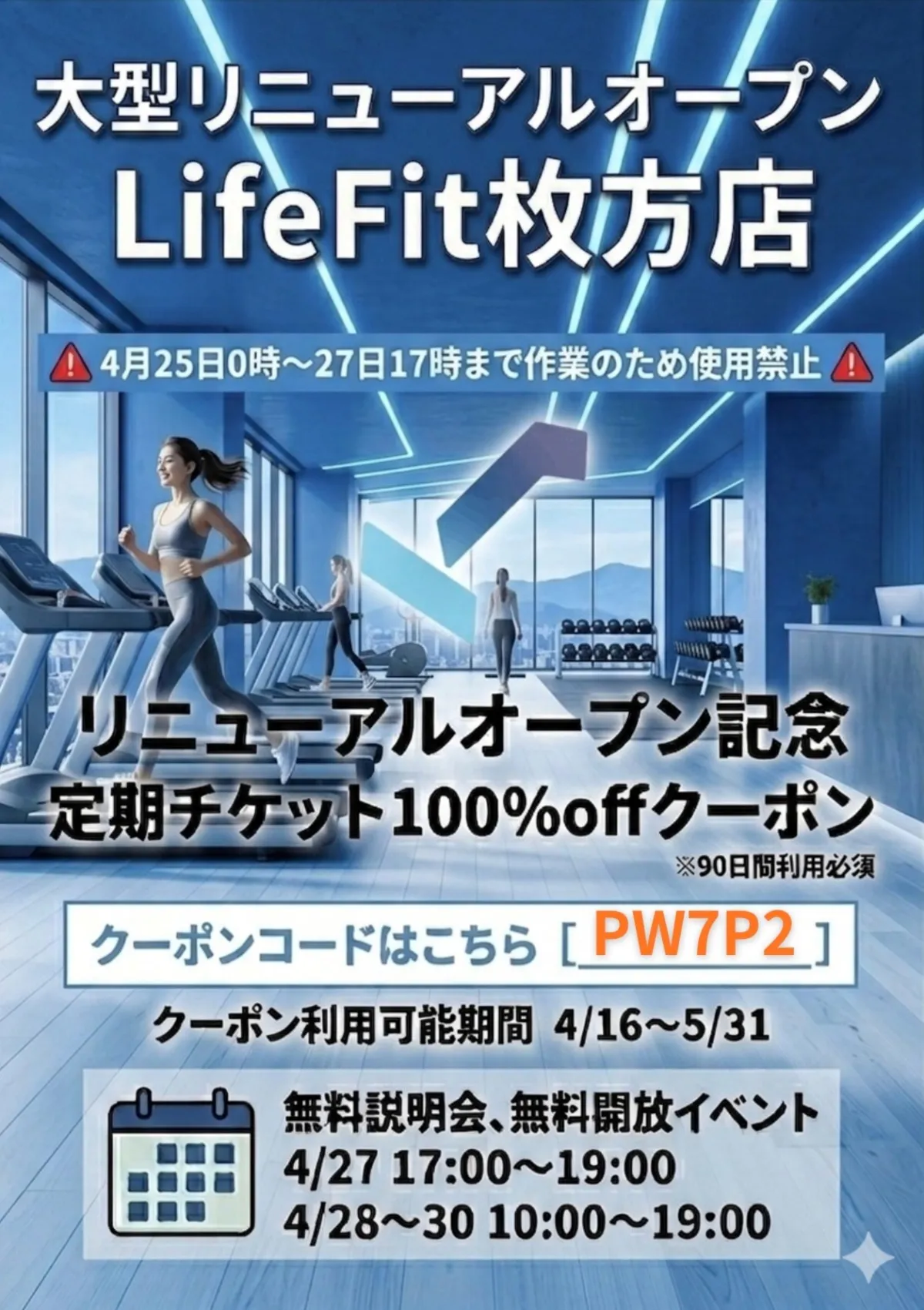 さらに、リニューアルを祝してお得な入会キャンペーンも実施中です。LifeFit枚方店に加え、姉妹店の楠葉店や枚方長尾店でも利用できる特典です。なんと、初月会費が通常2,980円のところ、リニューアル記念キャンペーンにより0円で始められます。この機会にトレーニングを始めてみたい方は、ぜひクーポンコード『PW7P2』を使って登録をしてみてください。なお、利用には90日間の継続が条件となりますのでご注意ください。