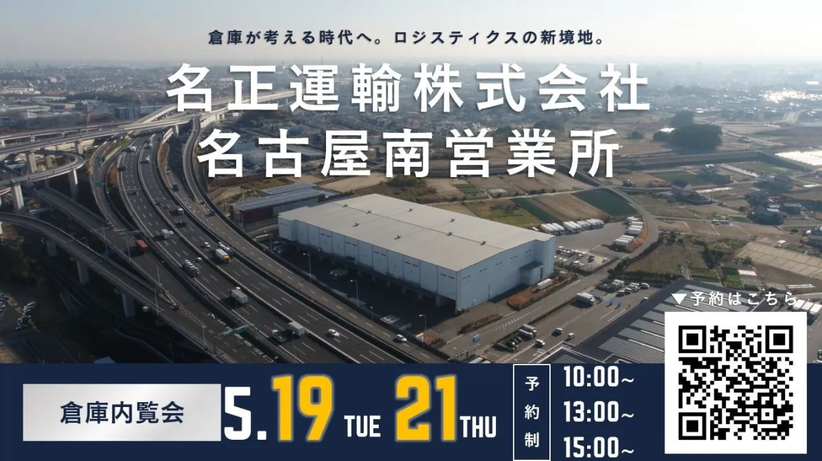 場所は名正運輸名古屋南営業所、愛知県大府市共和町別岨175。ただし、この内覧会は荷主企業および物流企業の方々に限られており、逆営業目的でのご予約はお断りしております。