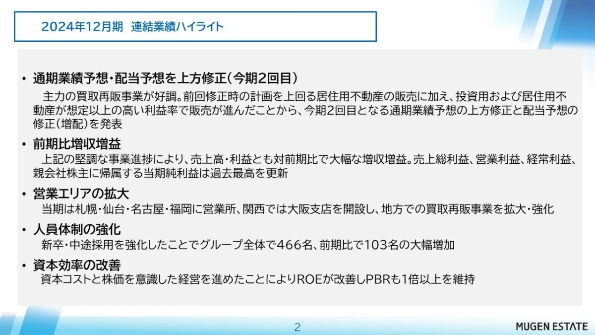 ムゲンエステートは主力の不動産買取再販事業を中心に、更なる強化と成長を図っていく方針を明らかにしました。2025年12月期の通期業績予想では更なる増収増益が見込まれており、今後の取り組みに対する期待が高まります。