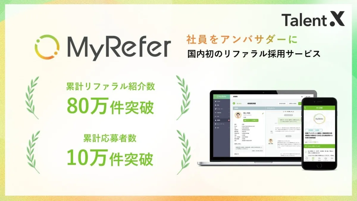 株式会社TalentXは、リファラル採用サービス「MyRefer」が累計リファラル紹介数80万件、応募数10万件を達成したことを発表しました。これは2015年から市場をリードしてきた「MyRefer」がもたらした成果の一つであり、当サービスは1,000社以上の企業に導入されています。特に注目すべきは、リファラル採用が日本企業にとってより身近になり、約6割がこの制度を導入している点です。この数字は、TalentXがリファラル採用の促進において大きな役割を果たしてきた証明です。