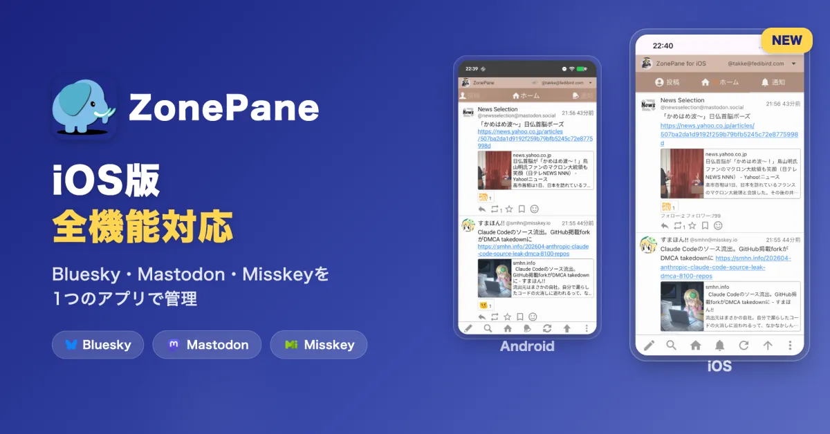 「ZonePane」は、Bluesky、Mastodon、Misskeyという3つの分散型SNSに対応したアプリで、これまでに累計で3万ダウンロードを突破しています。もともとは、旧Twitter用の「TwitPane」を元に開発され、今回のiOS版は2025年6月に開発がスタートしました。