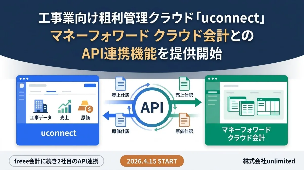 株式会社unlimitedが提供する工事業向けの粗利管理クラウドソフト「uconnect」が、2026年4月15日(水)から「マネーフォワード クラウド会計」とのAPI連携機能を新たに導入します。この機能により、ユーザーは「uconnect」で管理した売上や原価のデータを、ワンクリックで「マネーフォワード クラウド会計」に連携できるようになり、手間のかかる二重入力が不要になります。