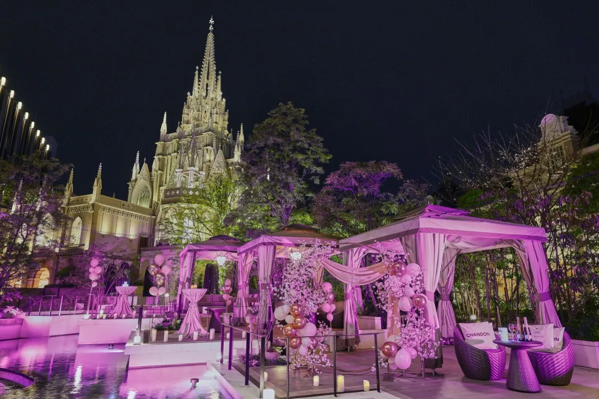 会場は、リゾート感あふれる中庭「カバナガーデン」。この日はシャンドン ロゼの鮮やかなピンク色に彩られ、心ときめくフォトジェニックな空間が広がります。幻想的なライトアップやバルーンで装飾された中庭では、自由に写真撮影を楽しむことができます。