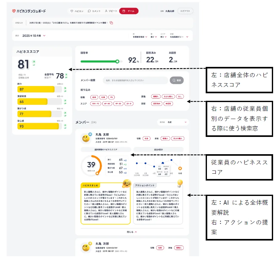ハピカンダッシュボードは、全国約880店舗で活用されているプラットフォームで、従業員の心の状況を可視化する「チームダッシュボード」と、顧客の来店状況を分析する「リピートダッシュボード」の2つの新機能が加わります。