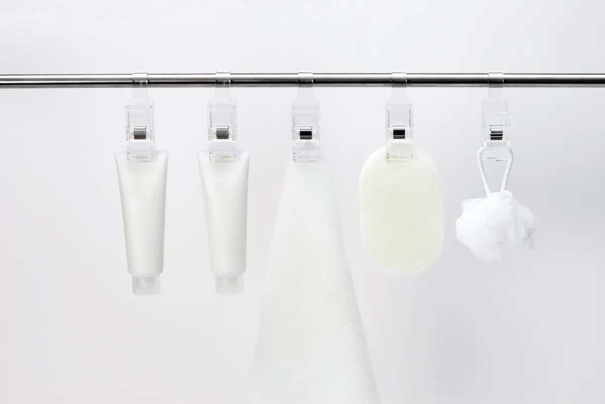 ライクイットのハンギングクリップは、洗顔料やオーラルケアグッズをバーに吊るして収納するアイテムです。接地面をなくすことで掃除が容易になり、清潔な環境を維持します。耐荷重も1kgまで対応しており、さまざまなアイテムをしっかりと収納可能です。