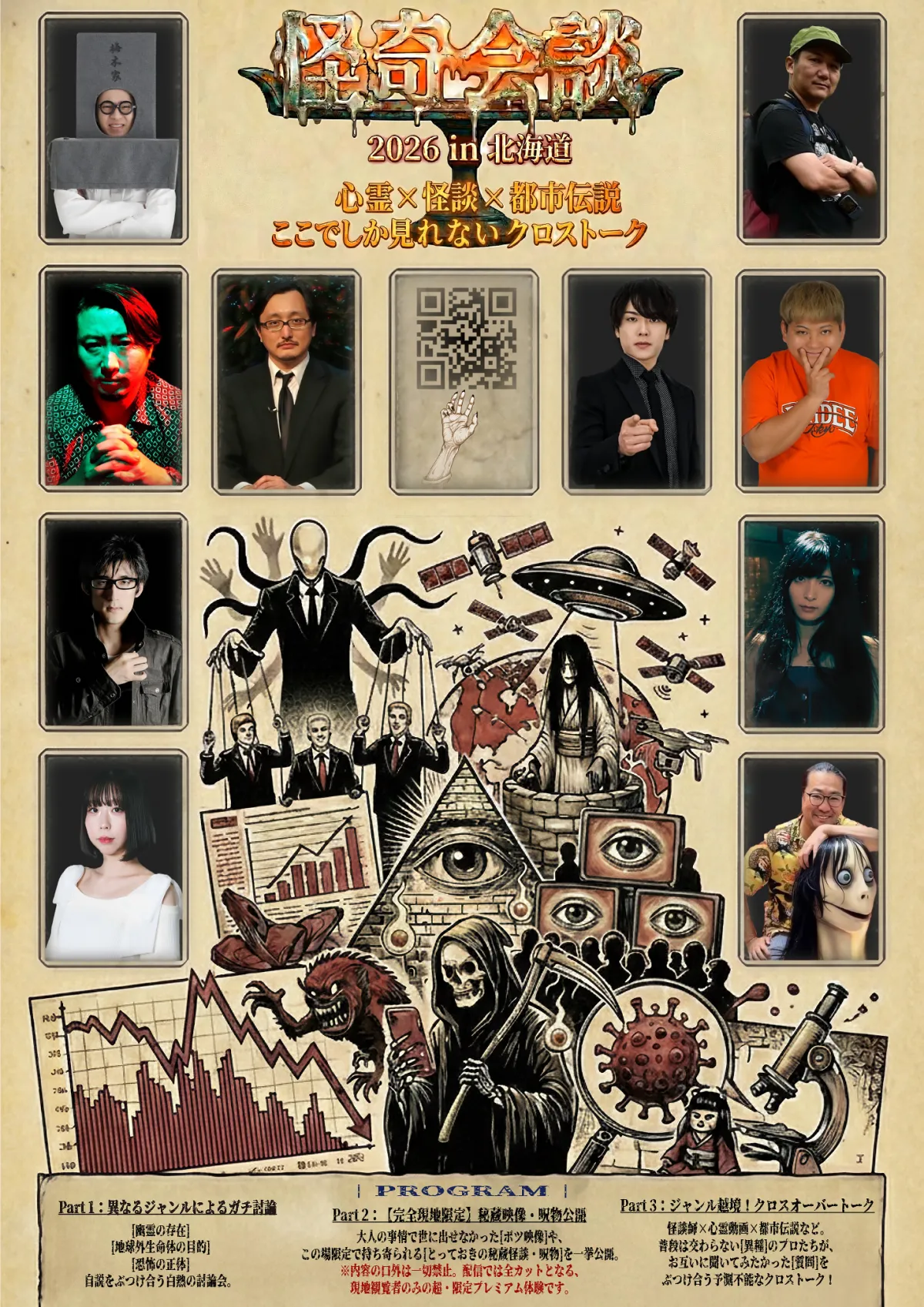 2026年3月20日(金・祝)、新千歳空港のポルトムホールにて、特異な知識を持つ元外務省職員がプロデュースする次世代型ホラーサミット『怪奇会談2026 in 北海道』が開催されます。このイベントには、異能のクリエイターたちが集結し、総フォロワー数約300万人を誇る豪華な顔ぶれが揃います。