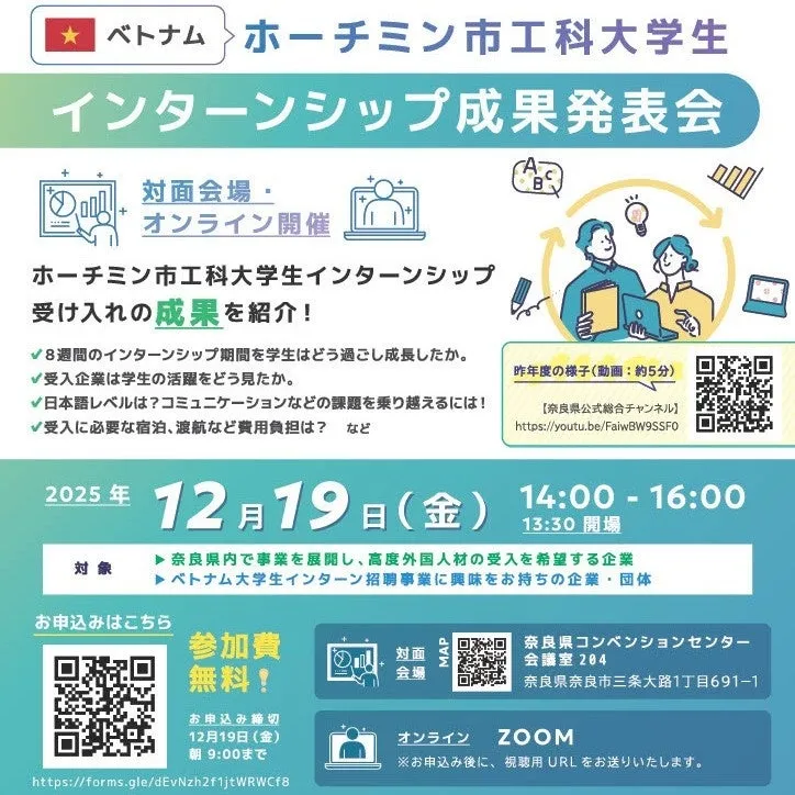 奈良県内で事業を展開し、高度外国人材の受け入れを希望する企業の皆さま、この発表会は特にお勧めです。また、ベトナム大学生インターン招聘事業に興味がある企業や団体の方も、是非ご参加ください。そして、インターンシップを通じて成長されてきた学生たちや受け入れ企業による発表を聞き、新たな視点を得るチャンスです。
