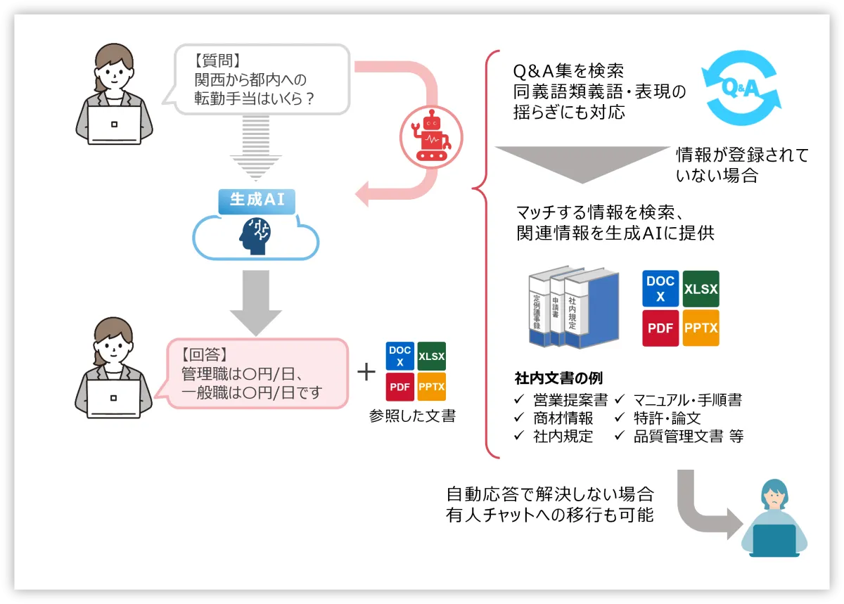 「生成AIチャット Pro」は、まず管理者が整備したQ&A集を参照し、その情報から必要な回答を引き出します。もしQ&A集に情報がない場合は、お客様が入力した社内の文書から情報を検索し、さらにはそれでも回答が得られない場合は有人チャットに繋ぐことができます。この流れによって、問い合わせ対応のスピードと正確性が両立されるのです。