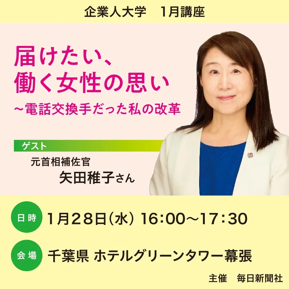 千葉県で、毎日新聞社が主催する「毎日新聞企業人大学」において、元首相補佐官・矢田稚子さんの特別講演が実施されます。講演のテーマは「届けたい、働く女性の思い~電話交換手だった私の改革」です。このイベントでは、矢田さんが自身の過去や経験を元に、現代における女性の働き方や直面する課題について語ります。