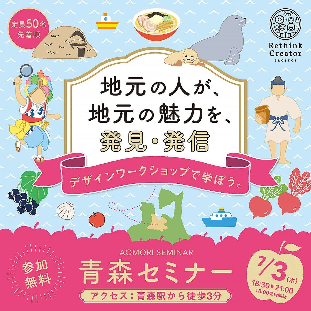 「Rethink Creator PROJECT 2025」セミナーは、全国で6地域にわたって開催予定であり、青森市では約150分のセミナーを通じて、地域に隠された魅力を発見する方法(Rethink)とその魅力をデザインで表現する技術(Create)を学びます。参加者は、地元の資源を使ってキャッチコピーやポスターを作成することによって、青森市の「当たり前」を再考し、新たな視点から発信する力を養います。なお、参加はどなたでも無料で、デザイン未経験者も大歓迎です。
