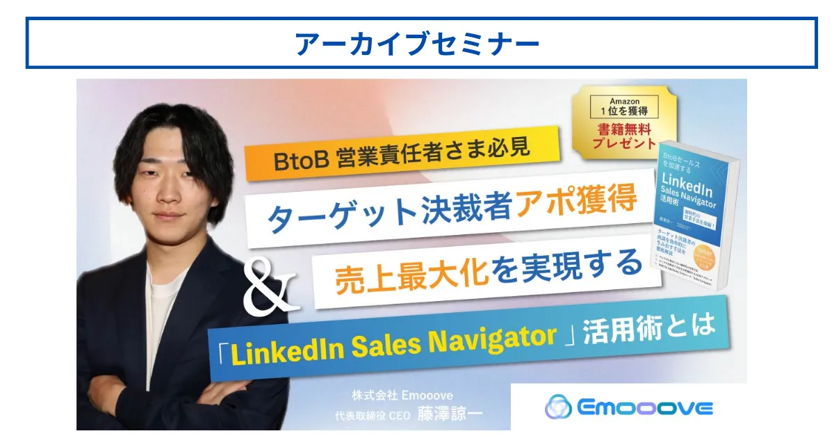 株式会社Emoooveは、2024年12月4日に開催されたウェビナー『ターゲット決裁者アポ獲得&売上最大化を実現する「LinkedIn Sales Navigator」活用術とは』を、当社公式ウェブサイトで限定公開しました。このウェビナーでは、LinkedInを駆使して従来の営業手法から脱却し、より効率的で効果的な営業アプローチについて解説しています。
