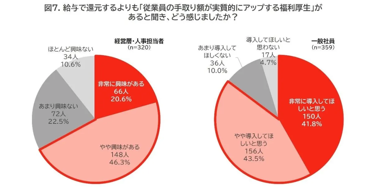 「第3の賃上げ」と呼ばれる、手取り額を実質的に増加させる福利厚生の認知度は約4割に過ぎません。しかし、認知していない経営層や人事担当者の約7割がその導入に興味を示し、多くの一般社員も導入を希望しています。特に中小企業では、導入企業の満足度が非常に高く、約9割の企業がその効果を実感しているとの結果が出ています。このように、賃上げと並行して企業が福利厚生に力を入れることの重要性がますます高まっているのです。