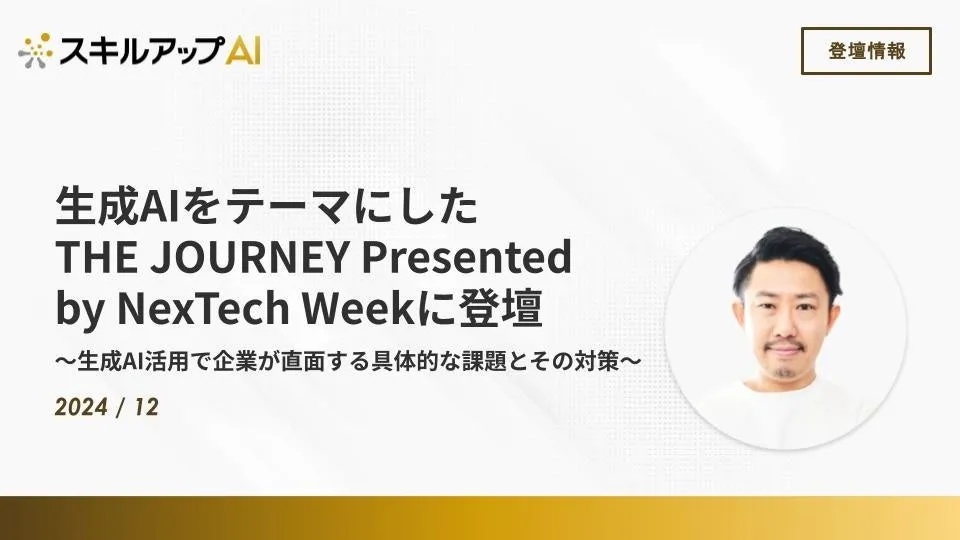 2023年、府に初めて開催された生成AIをテーマにしたオンラインカンファレンス『THE JOURNEY Presented by NexTech Week』において、株式会社スキルアップNeXtの取締役COO、福島昌吾氏が登壇しました。このイベントでは、生成AI活用における企業の直面する具体的な課題やその解決策について、豊富な事例を交えて解説が行われました。