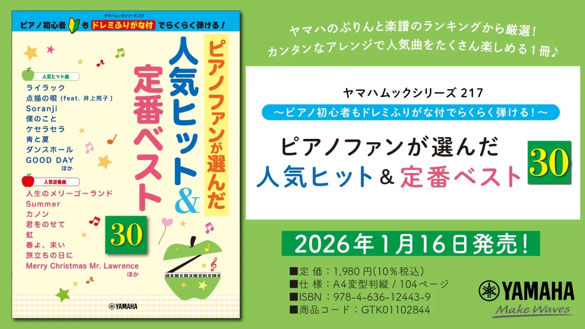 2026年1月16日に、ヤマハミュージックエンタテインメントホールディングスから「ヤマハムックシリーズ217 ~ピアノ初心者もドレミふりがな付でらくらく弾ける!~ ピアノファンが選んだ人気ヒット&定番ベスト30」が発売されます。この新刊は、ピアノ初心者が楽しく演奏できるように配慮された楽譜集で、魅力的な内容が詰まっています。