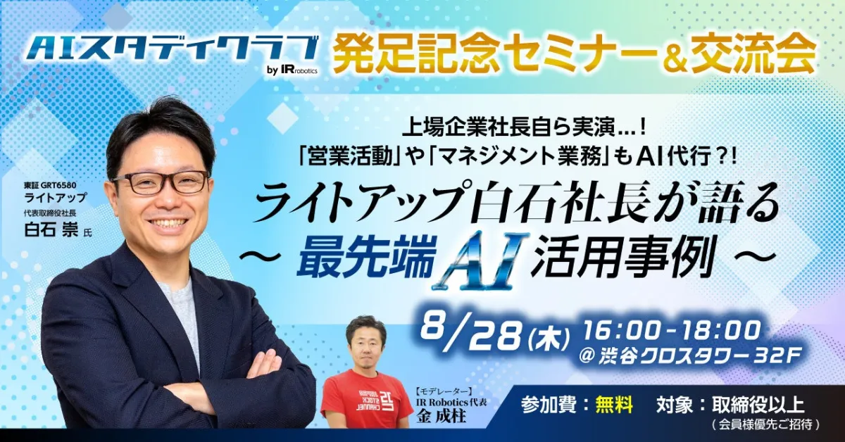 経営層には常に新たな知見が求められますが、最近のビジネス環境では特にAIの活用が重要視されています。そこで、新たに設立される「AIスタディクラブ」の発足を記念し、特別なセミナーと交流会が開催されることが決定しました。このイベントは、株式会社IR Roboticsが主催し、経営層のみならず、社内AI推進担当や各事業部長も参加対象としています。