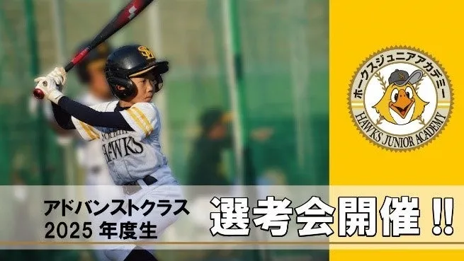 福岡ソフトバンクホークスが新小学5年生と6年生を対象にしたジュニア最上級クラス「アドバンストクラス」の2025年度生選考会を開催することが発表されました。この選考会は、福岡ソフトバンクホークスのジュニアアカデミー・ベースボールスクールによって実施され、将来にわたるプロ野球選手の育成を目指しています。