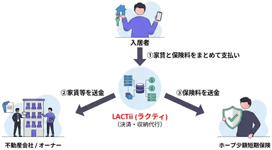 新たに導入される「LACTii(ラクティ)」というサービスは、エルズサポートが提供するもので、賃貸借契約に基づく家賃と保険料を一括して収納代行するスキームです。これにより、入居者は家賃と保険料を一度の支払いで済ませることができ、未払いによる保険契約の解除(無保険状態)を防ぐことができます。さらに、このシステムによって、関係する各社の事務工数が削減され、営業面での効率化も期待されています。