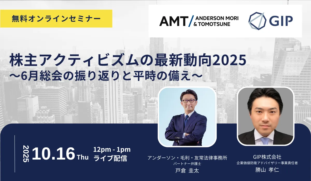 GIP株式会社が2025年10月16日(木)に開催するウェビナー「株主アクティビズムの最新動向2025~6月総会の振り返りと平時の備え~」に注目が集まっています。このセミナーでは、上場企業の株主との関係が今後いかに変化していくのか、また企業はどのように備えていく必要があるのかを探っていきます。