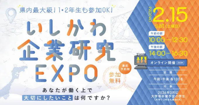 2025年2月15日(土)、石川県内で就職活動をしている学生向けに、オンラインイベント「いしかわ企業研究EXPO」が開かれます。このイベントは、県内の幅広い業界に属する多くの企業が参加し、学生自身のキャリアの選択肢を広げる絶好の機会となります。