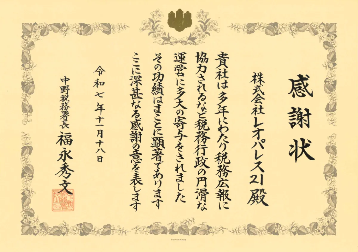 株式会社レオパレス21は、2025年11月18日(火)に東京都港区の明治記念館で行われた授与式において、中野税務署より感謝状を授与されました。この感謝状は、主にアパートオーナーへ向けたe-Taxの普及に協力したことが表彰されたものです。
